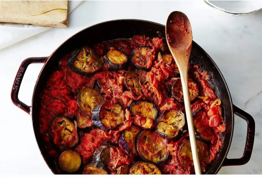سپس داخل همان تابه ابتدا گوجه را بچیند سپس سیب زمینی و در انتها بادمجان وفلفل دلمه ای را بچینید.