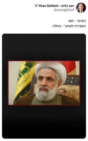 به گزارش پارسینه؛ یوآو گالانت، وزیر دفاع اسرائیل با انتشار تصویری از شیخ نعیم قاسم نوشت: