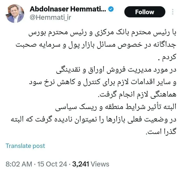 به گزارش ایسنا، عبدالناصر همتی در صفحه توییتر خود نوشت: با رئیس بانک مرکزی و رئیس سازمان بورس جداگانه در خصوص مسائل بازار پول و سرمایه صحبت کردم.