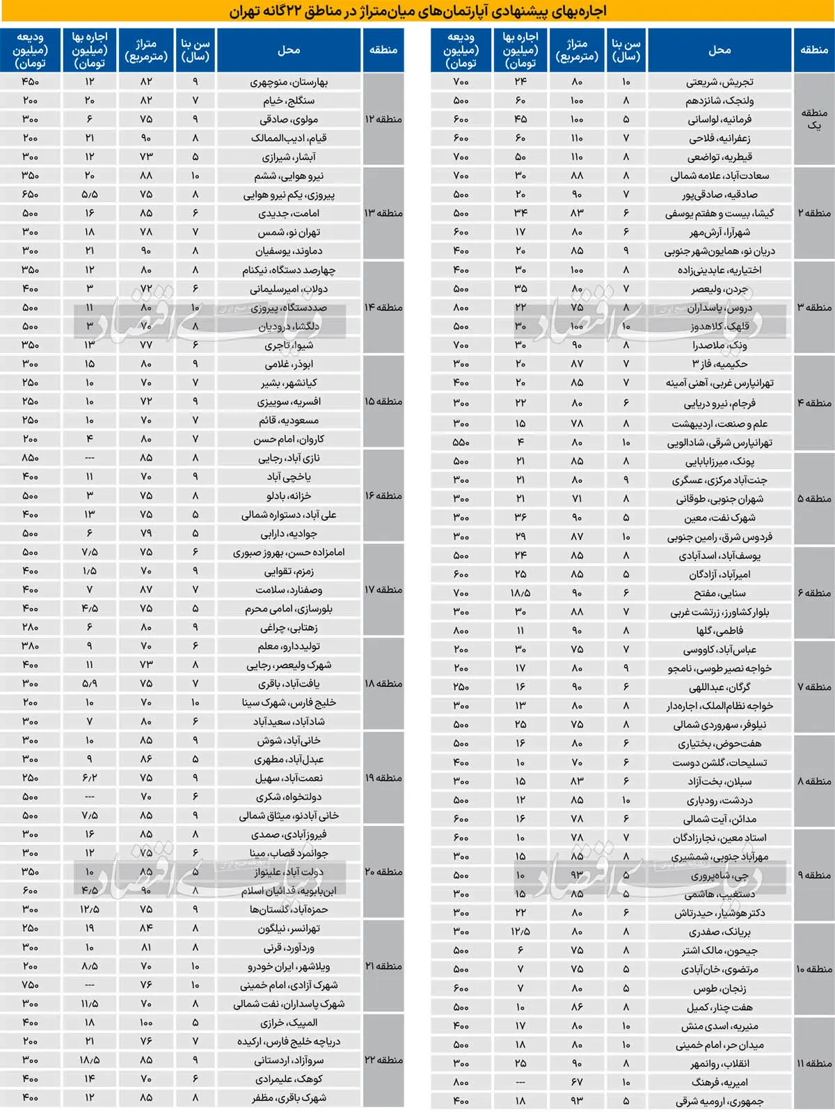 بر اساس تحقیقات میدانی «دنیای‌اقتصاد» از فایل‌‌‌های ارائه‌شده در بازار اجاره، میانگین «اجاره‌‌‌بهای پیشنهادی» در محله‌‌‌های منتخب 22 منطقه تهران در مهرماه به صورت 400 میلیون تومان پول پیش و 16 میلیون تومان اجاره‌‌‌بهای ماهانه برای واحدهای مسکونی میان‌متراژ با میانگین 81.5 مترمربع و میانگین عمربنای 5 تا 10 سال است. اما این ارقام پیشنهادی در مقایسه با نیمه تابستان با تغییراتی همراه بوده است. داده‌‌‌های مهر ماه باتوجه به ماحصل تبدیل کامل «پول پیش به اجاره‌‌‌بهای ماهانه» حاکی از اجاره آپارتمان با میانگین اجاره‌‌‌بهای ماهانه مترمربعی حدود 370هزار تومان است. این رقم کاهش 4درصدی در مقایسه با داده‌‌‌های مرداد ماه را نشان می‌دهد. ارقام به دست آمده بر اساس تحقیقات میدانی «دنیای‌اقتصاد» است.